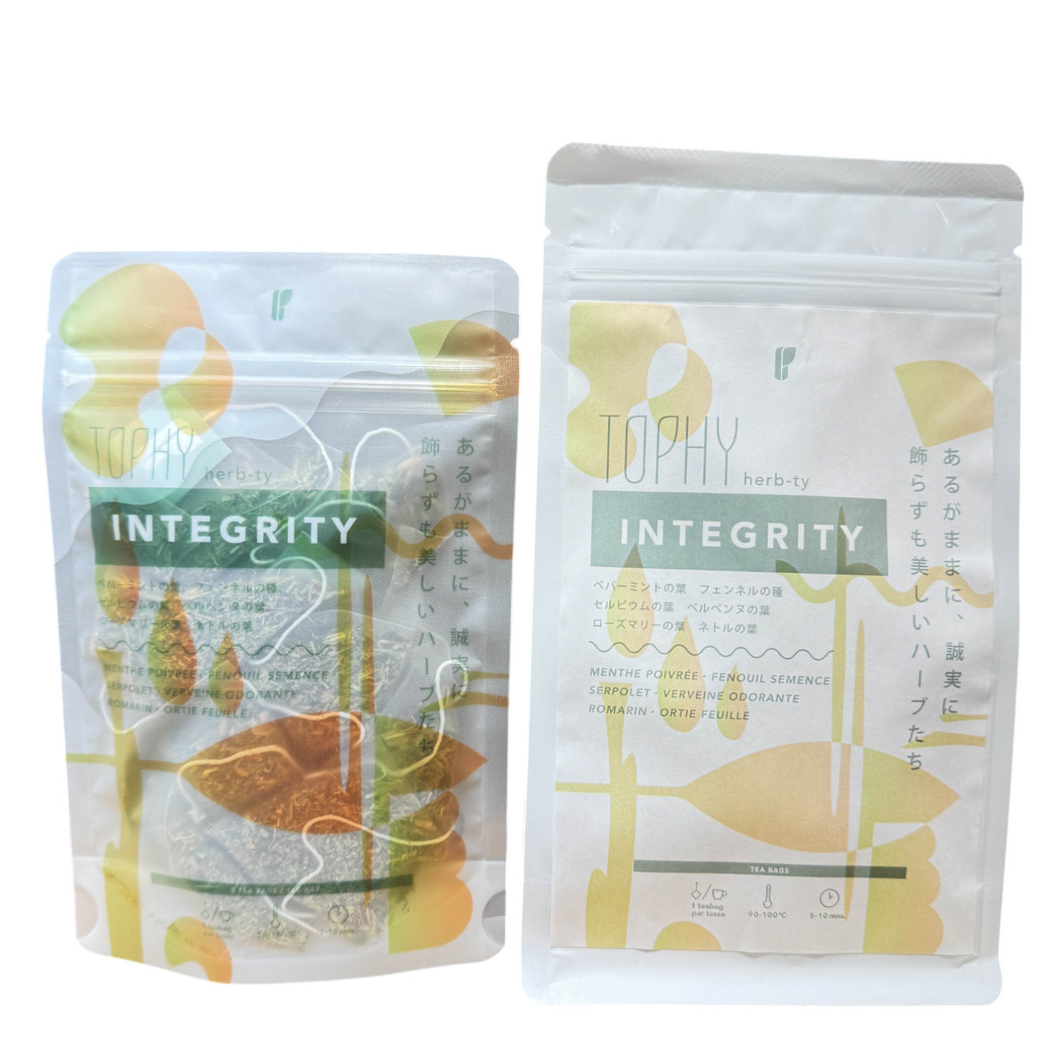 ペパーミントやローズマリーをはじめフェンネル、セルピウム、ベルベンヌ、ネトルの6種をブレンドした「インテグリティ」。爽やかな香りが心地よいです。温めるハーブが揃っているブレンドで、パワーがほしい時やタスクが山盛りで慌ただしい時の気分転換に取り入れたいブレンドです。