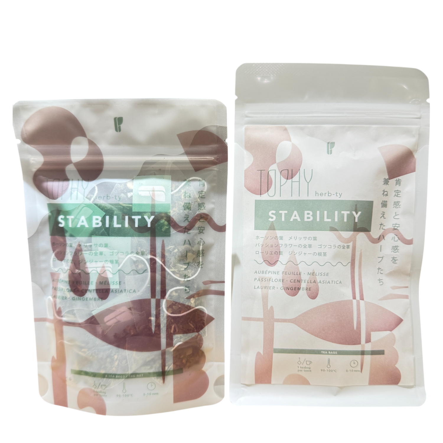 ゆらぐ時期に寄り添う「スタビリティ」。ホーソン、メリッサ、パッションフラワー、ゴツコラ、ローリエ、ジンジャーといった安定感をもたらすハーブを含有しています。