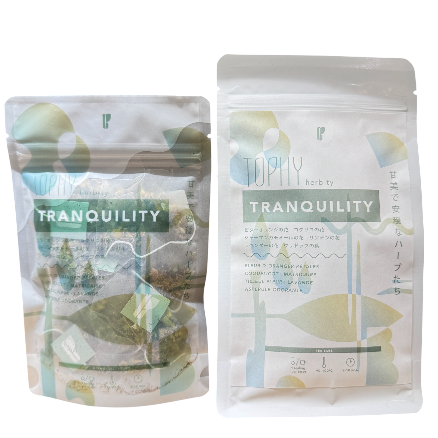タンブラーやマグカップを使って、お湯を注いで待つだけでできる手軽さも魅力の一つである「TOPHY」。カオリさんがお店を開く前に開発したもので、フランスで製造されている特別な製品です。そのため、セルピウムやウッドラフなどティーバッグでは珍しいハーブが盛りだくさん!