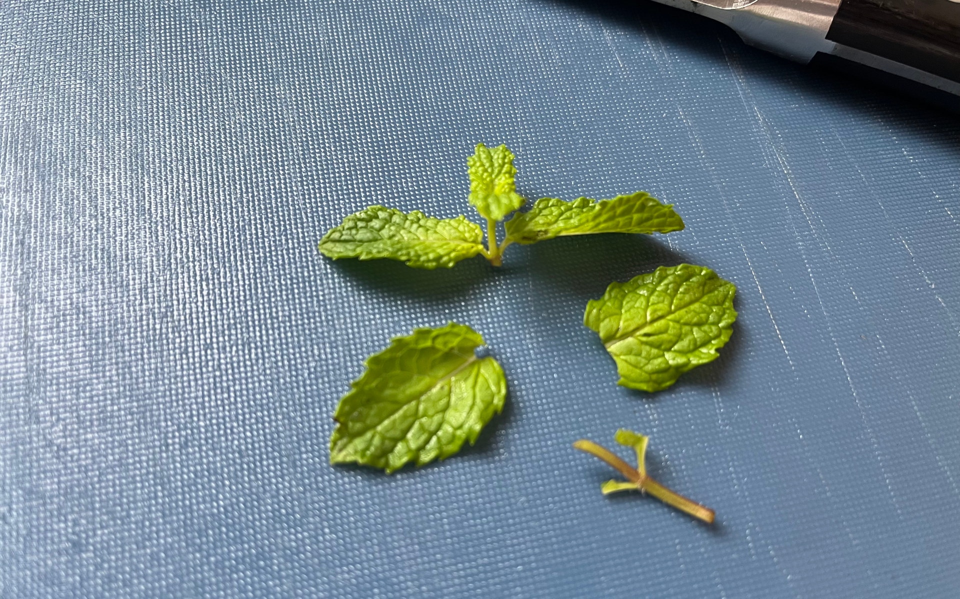 それから、炒めている間に、ミントとパクチーの葉っぱを手で少しちぎって香りを出しておきます。香りが飛んでしまうので、ちぎる作業はなるべく直前にすることをお勧めします。