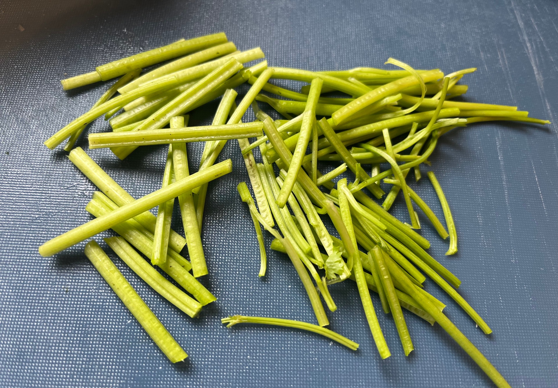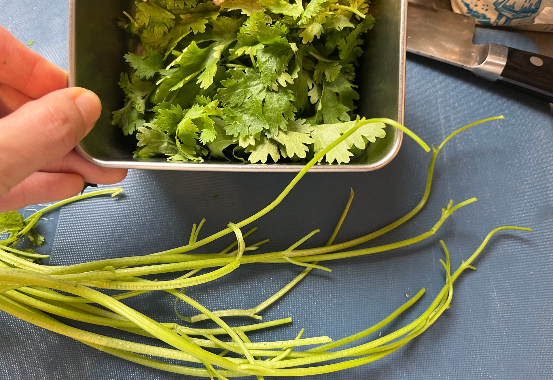 パクチーの茎の固さも大好き!という方は全部まとめてカットしてください。個人的には茎に少し火を通し、葉はフレッシュ感が欲しいのであえて分けています。
