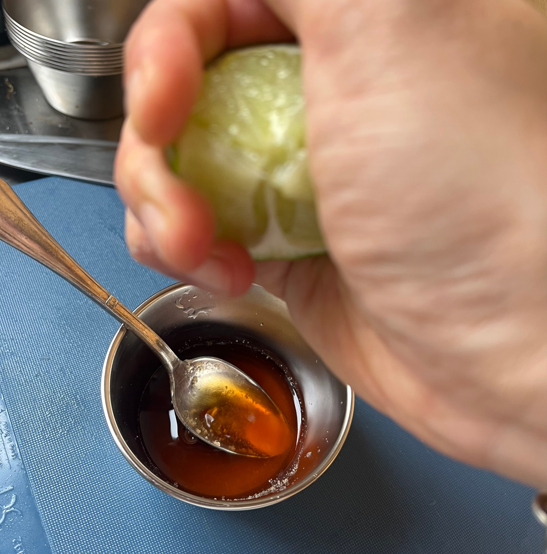 調味料(ナンプラー、砂糖、ライム)を全て合わせて小さな器で混ぜておきます。ライムの果汁を絞っていますが、レモンやレモン汁でもOKです。