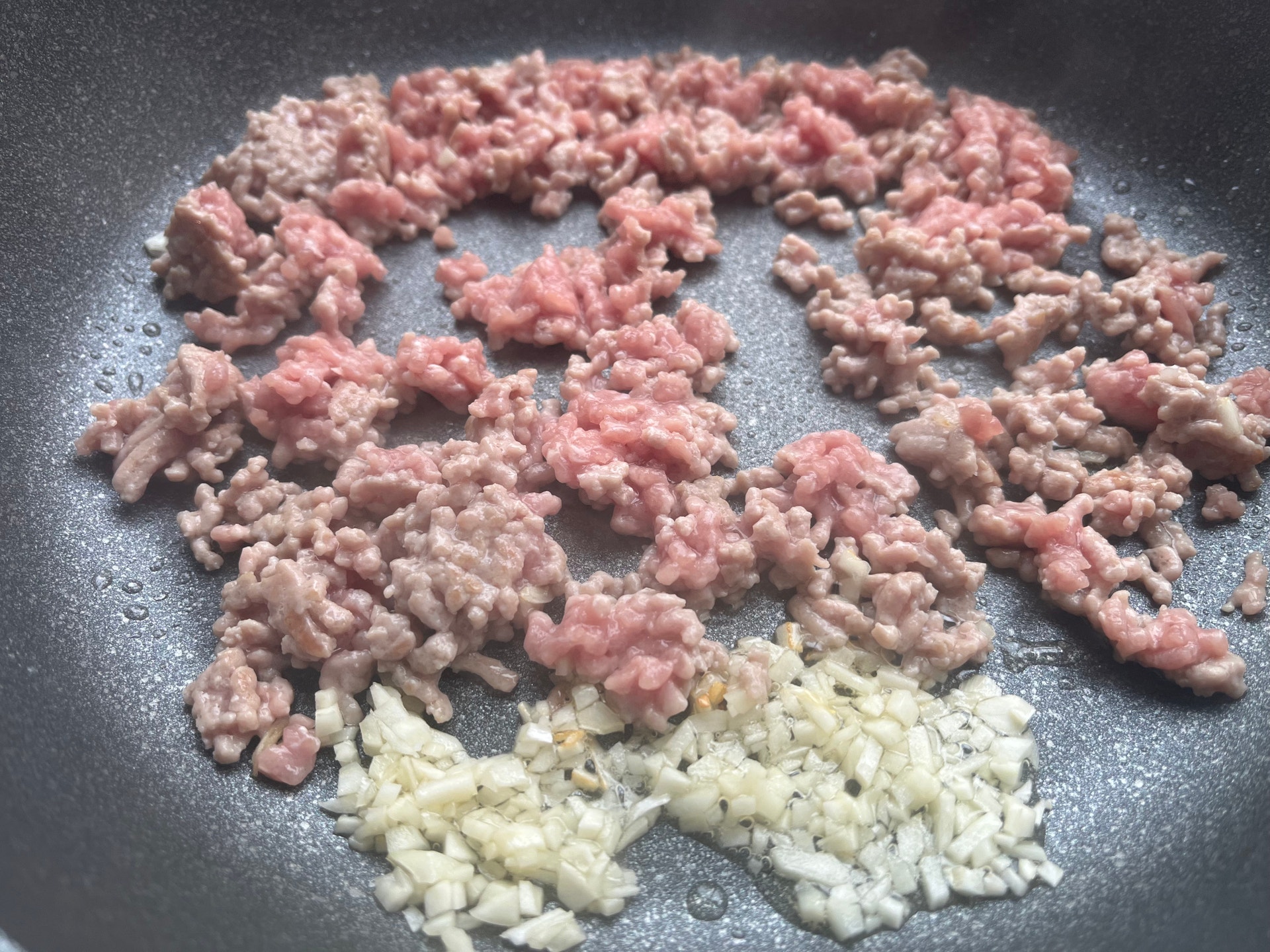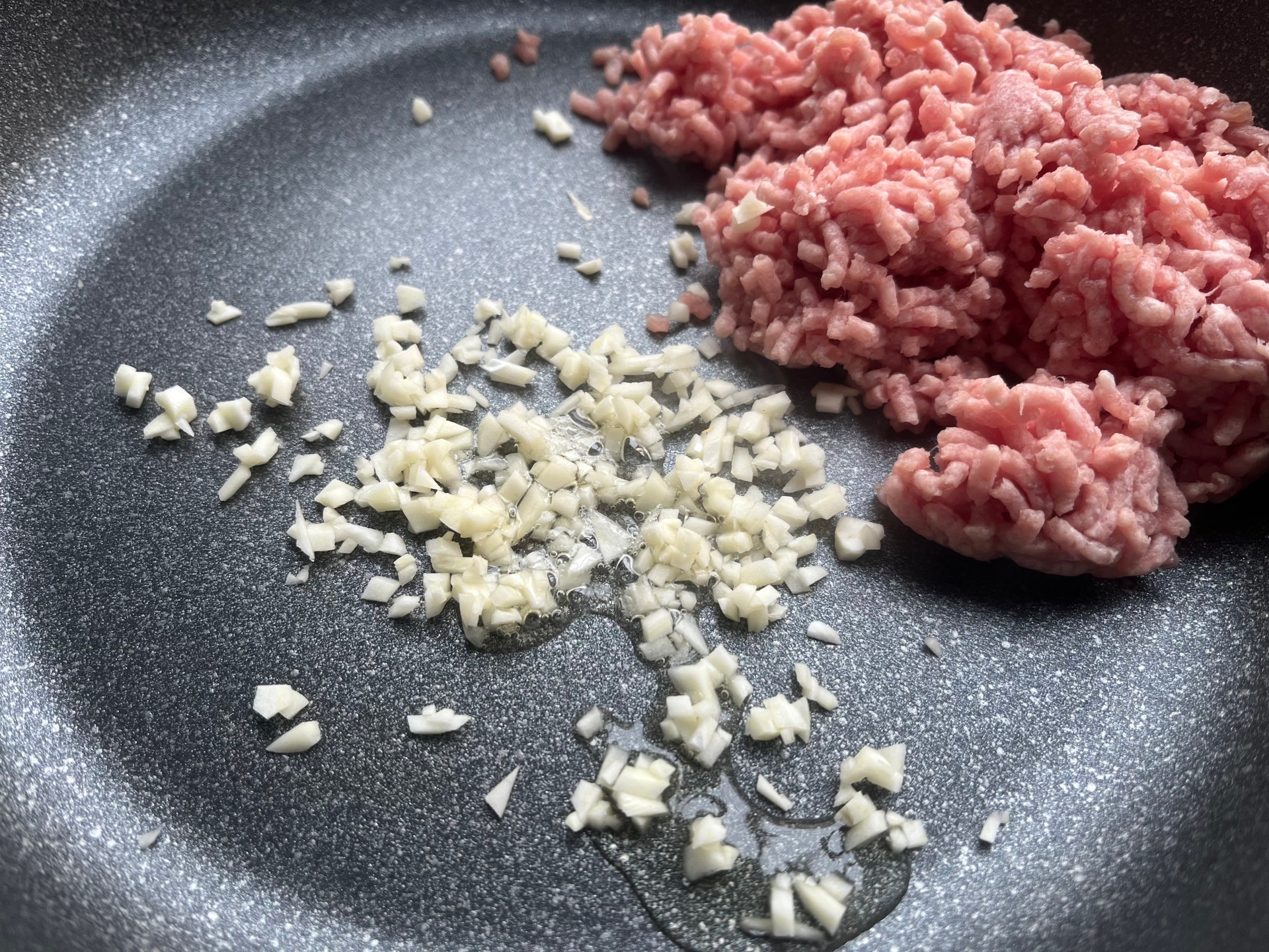 片側にニンニクが入っているフライパンに、ひき肉を入れます。
