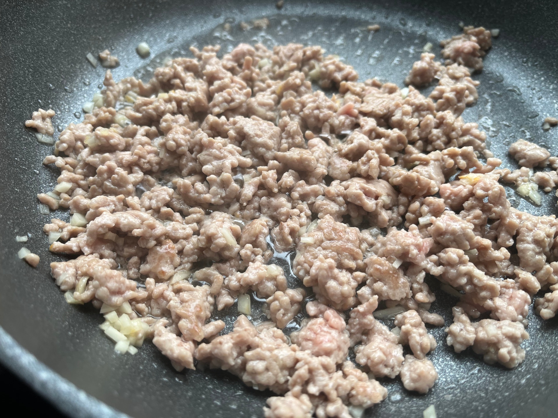 豚肉にひとつまみ塩をして、中火で加熱します。ニンニクをキツネ色にする必要はありません(ペペロンチーノじゃないよ)。