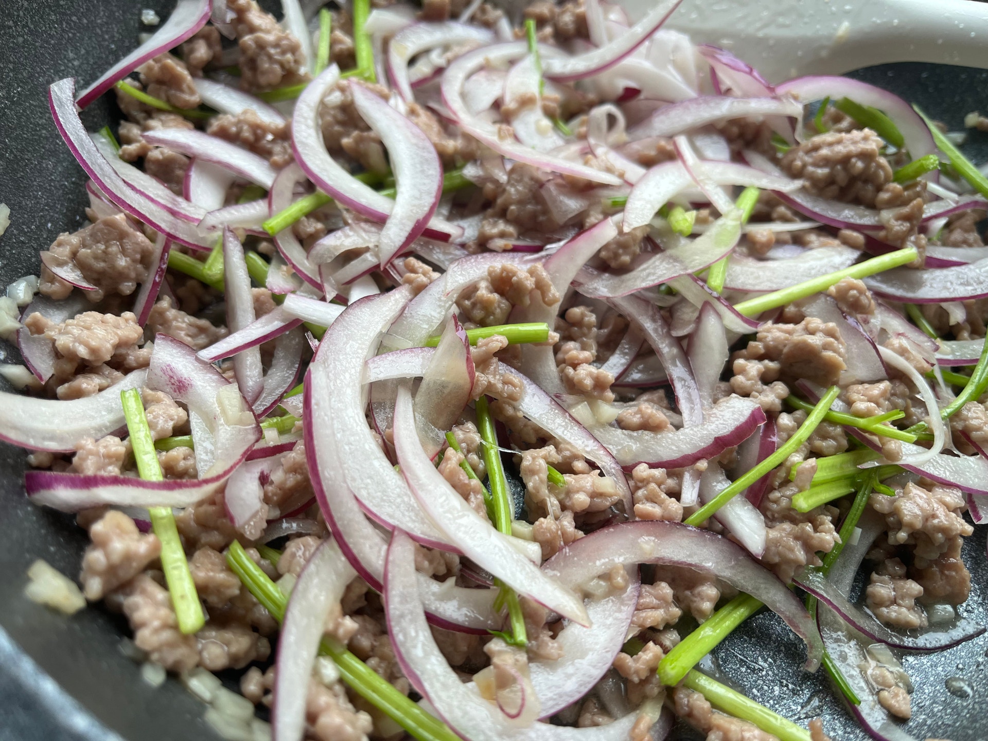赤玉ねぎとパクチーの茎の部分を入れます。