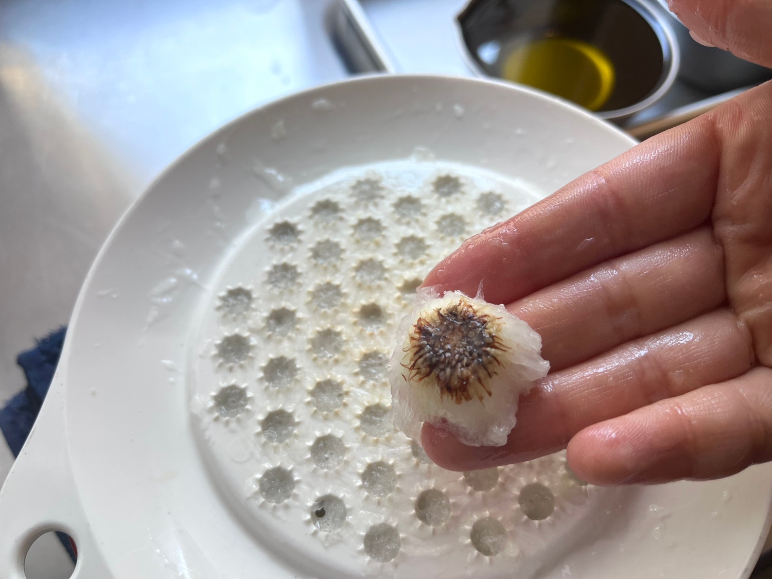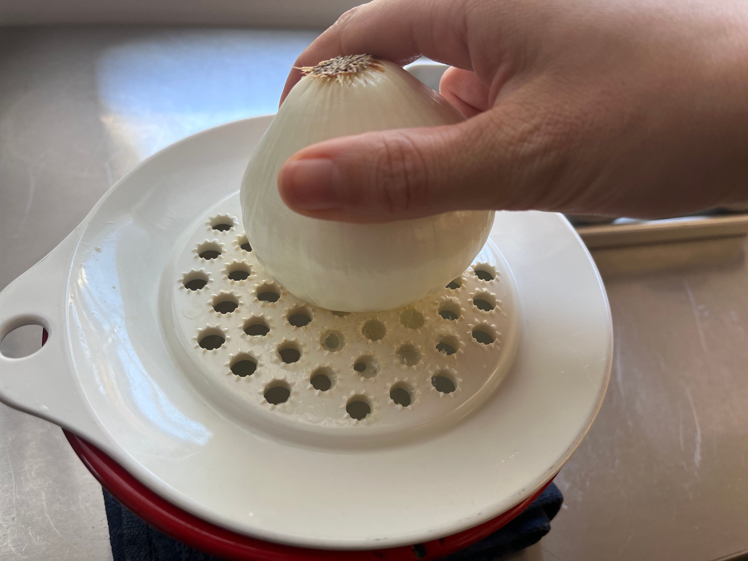 ここで縦に動かさず、おろし器全体を広く使って円を描くように玉ねぎを動かします。無理やり力を入れて早くすりおろす意識ではなく、玉ねぎを愛でるようなイメージで。