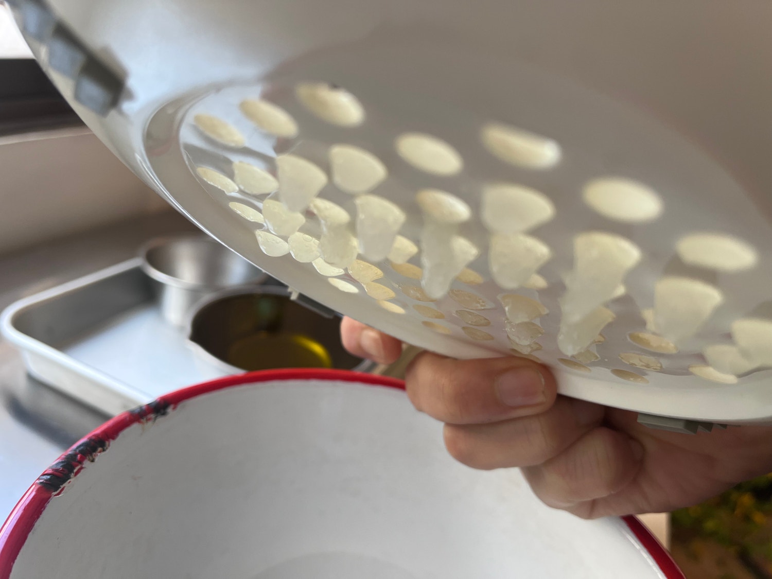 たまにボウルを確認してみましょう。ちゃんとキメの細かい玉ねぎが下に落ちてきていますね。順調です。