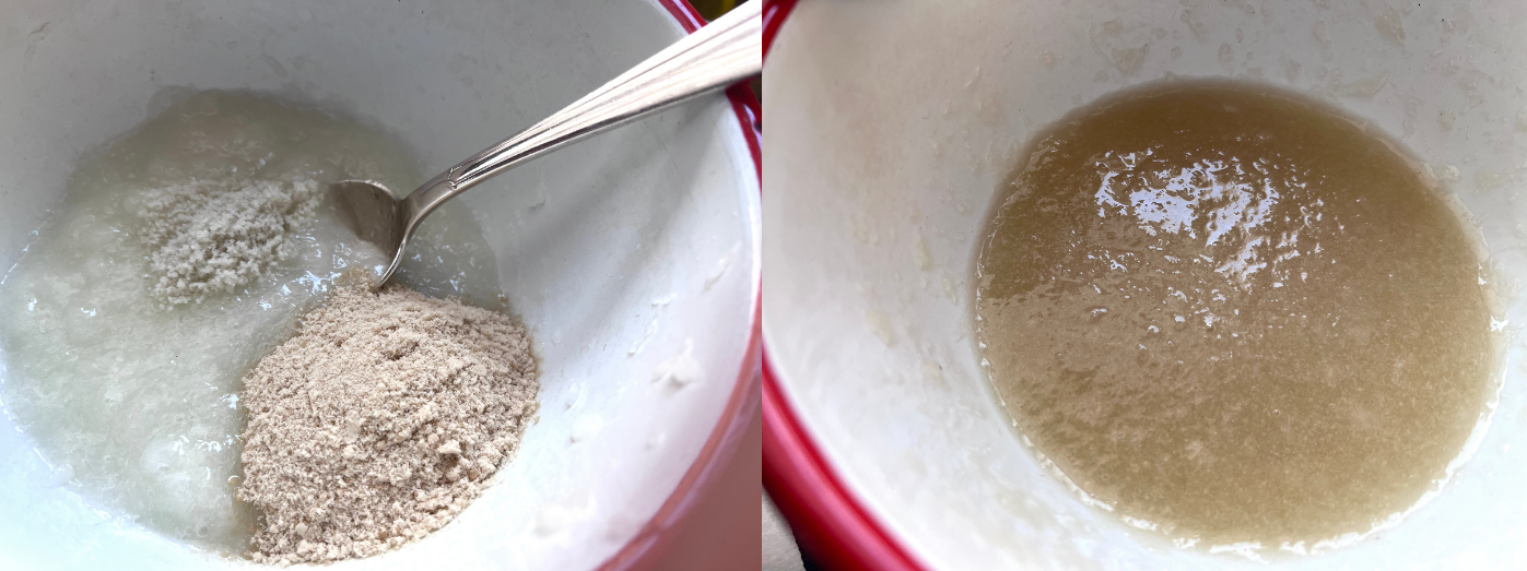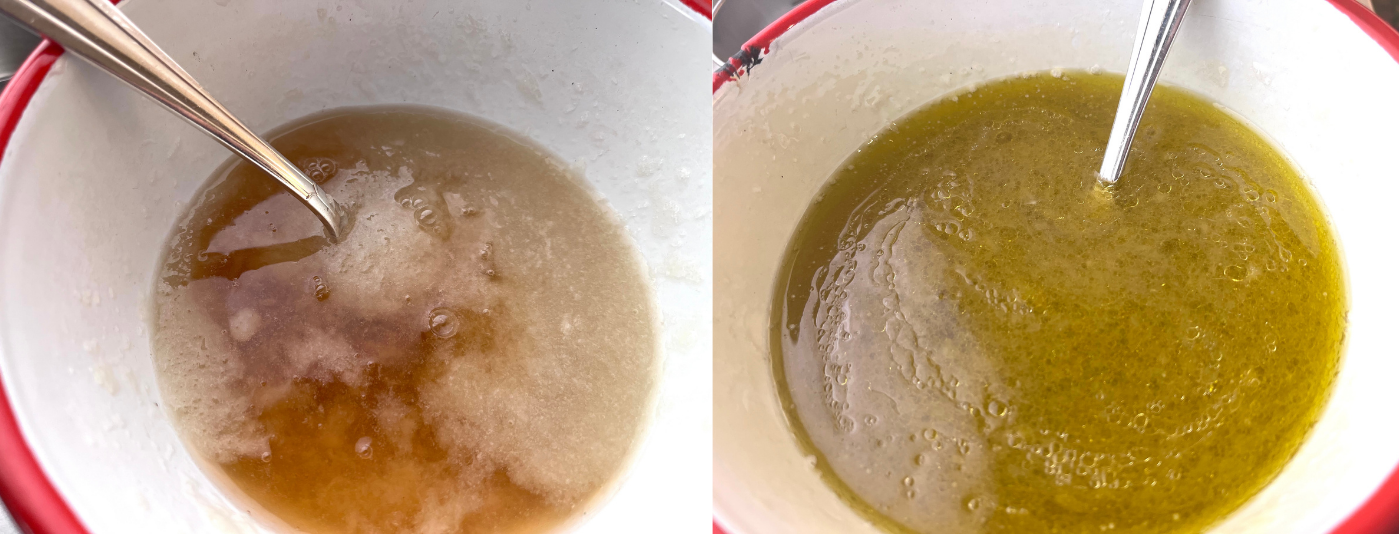 しっかり溶けたら、お好みの酢を加えてよく混ぜ、最後にオイルを混ぜます。