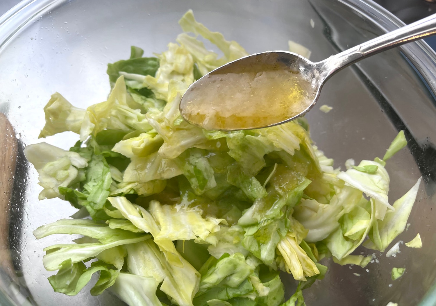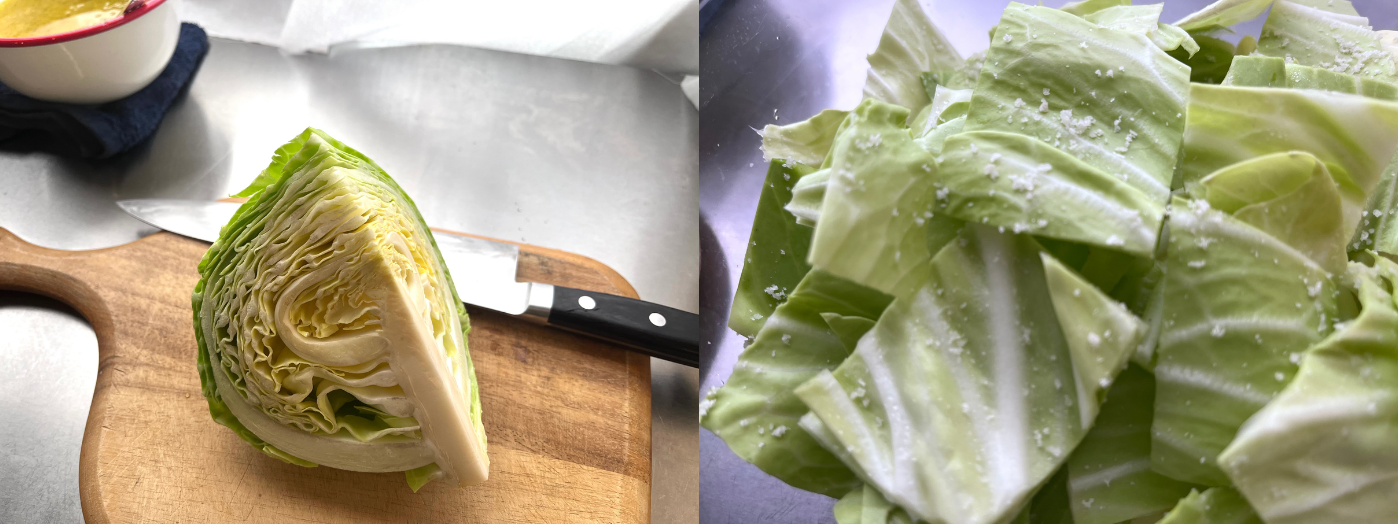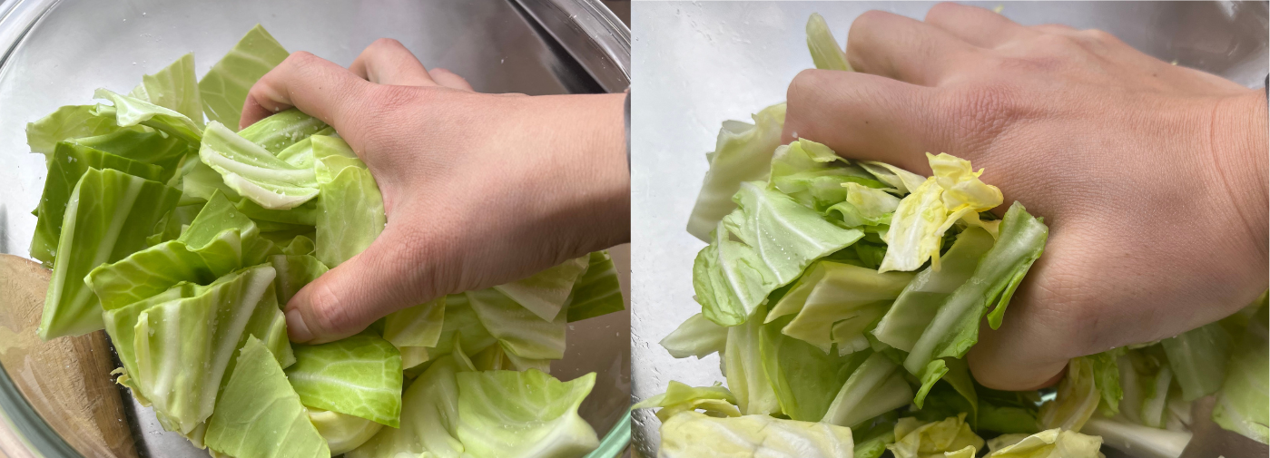 全体に塩をまぶしてから、キャベツを鷲づかみに。揉むというより、そのままギューッと押すようなイメージで。