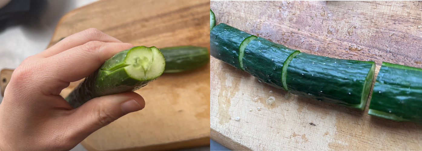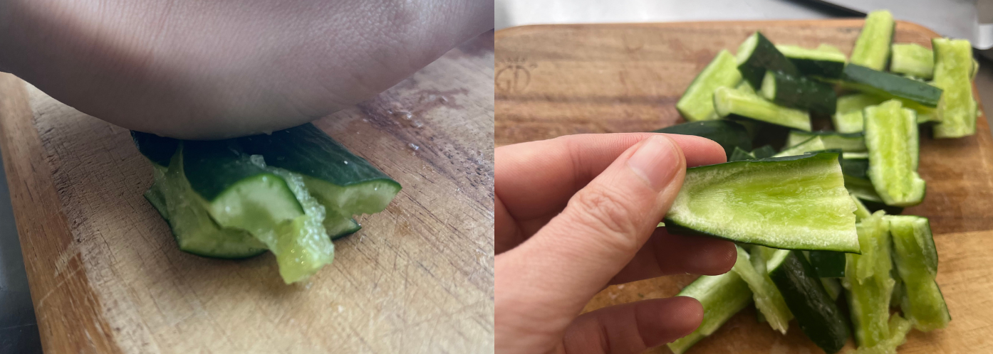 ※よく、叩きキュウリってありますよね。麺棒や瓶で叩いて作る方法だとキュウリが粉々になってしまうので。僕はもう少し丁重に扱いたいです。食材に愛を持ってね。