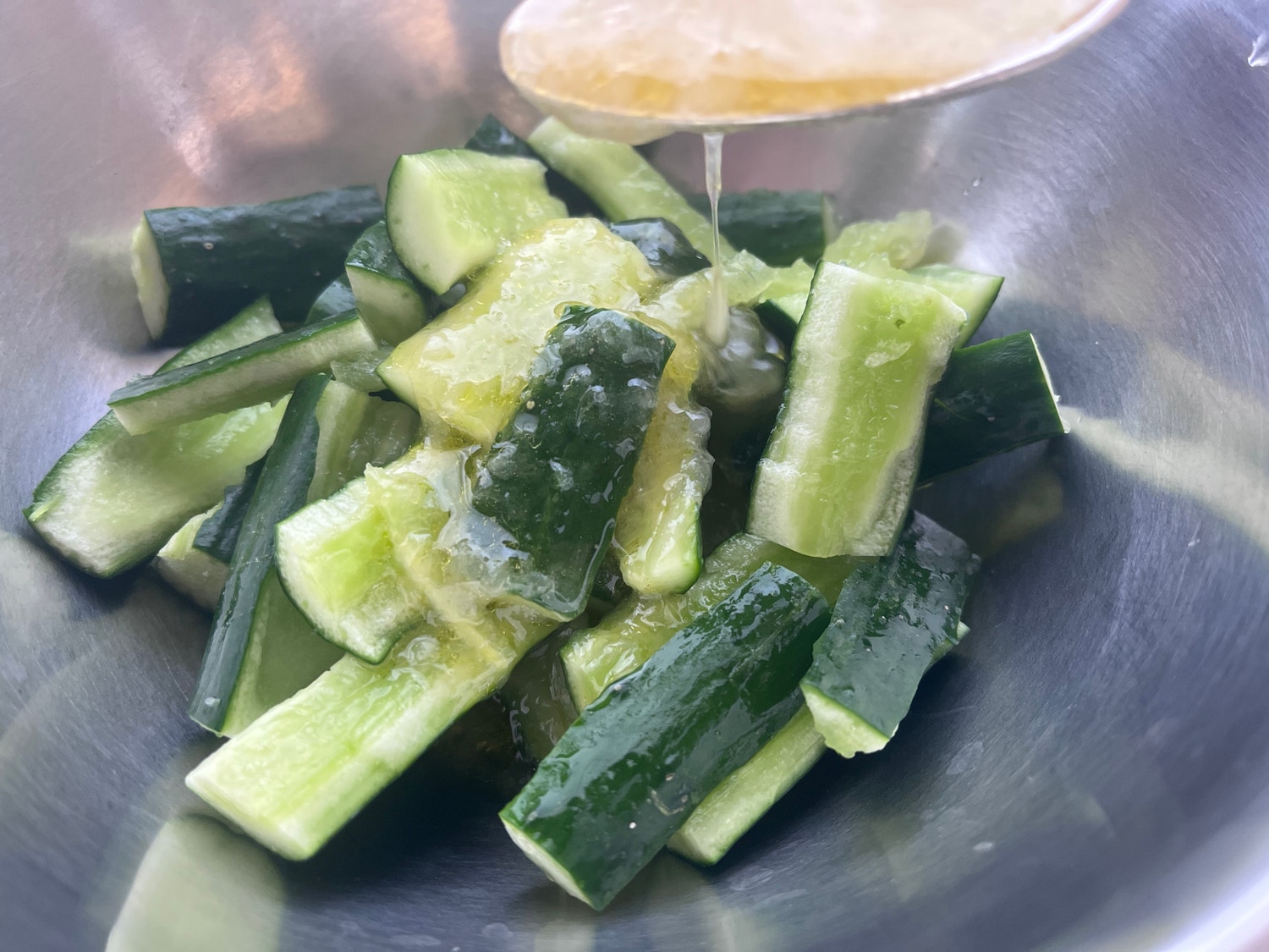 柚子胡椒やワサビなど、少し混ぜてもおつまみにピッタリです。ドレッシングを纏ったキュウリは艶やかで美味しそうですよ。