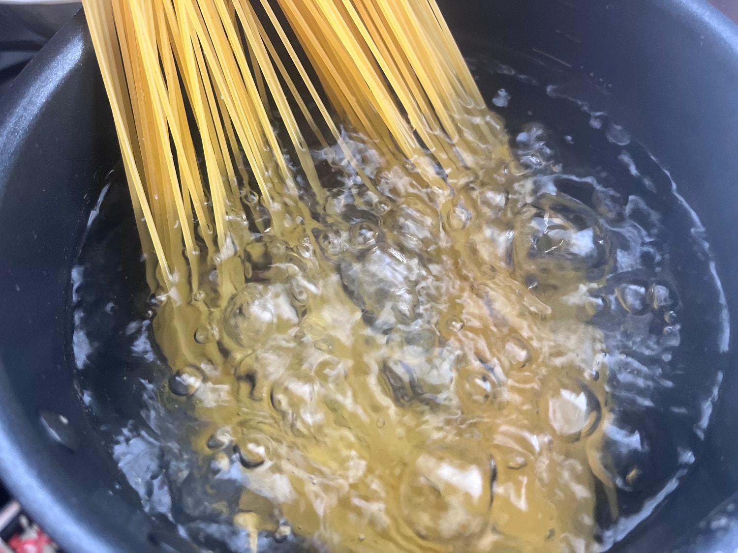 パスタ1人前80gくらい、しっかり塩気のあるお湯で茹でます。袋に記載の茹で時間より30秒ほど早くタイマーをセット!