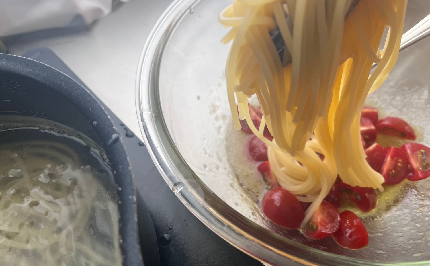 タイマーが鳴ったら、トングなどでそのままボウルに麺を移動します。