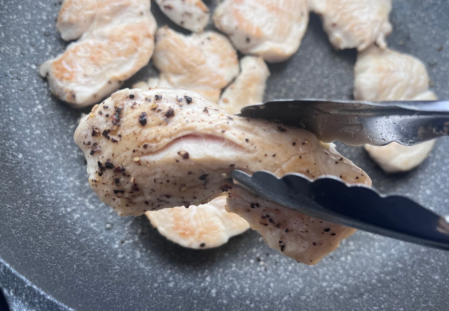 繊維で肉が割れるので、トングか箸で掴んで裏を見てみましょう。断面にも火が通っているか確認が簡単にできますよ!!