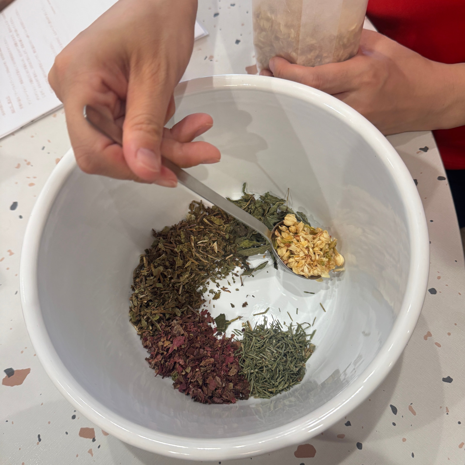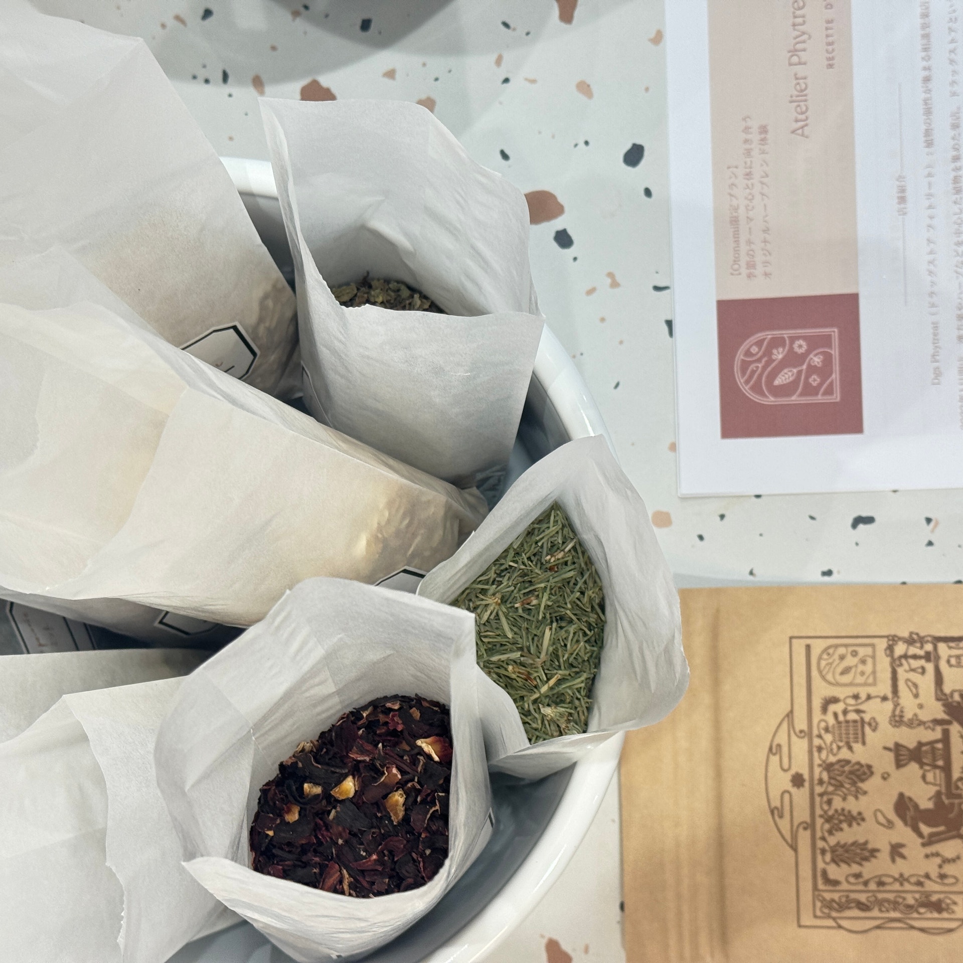 お店では体験型サービスを提供する予約サイト「Otonami」限定のワークショップ「アトリエ フィトリート」を開催しました。こちらは、テーマに則ったハーブを自身でカスタマイズしていくものです。