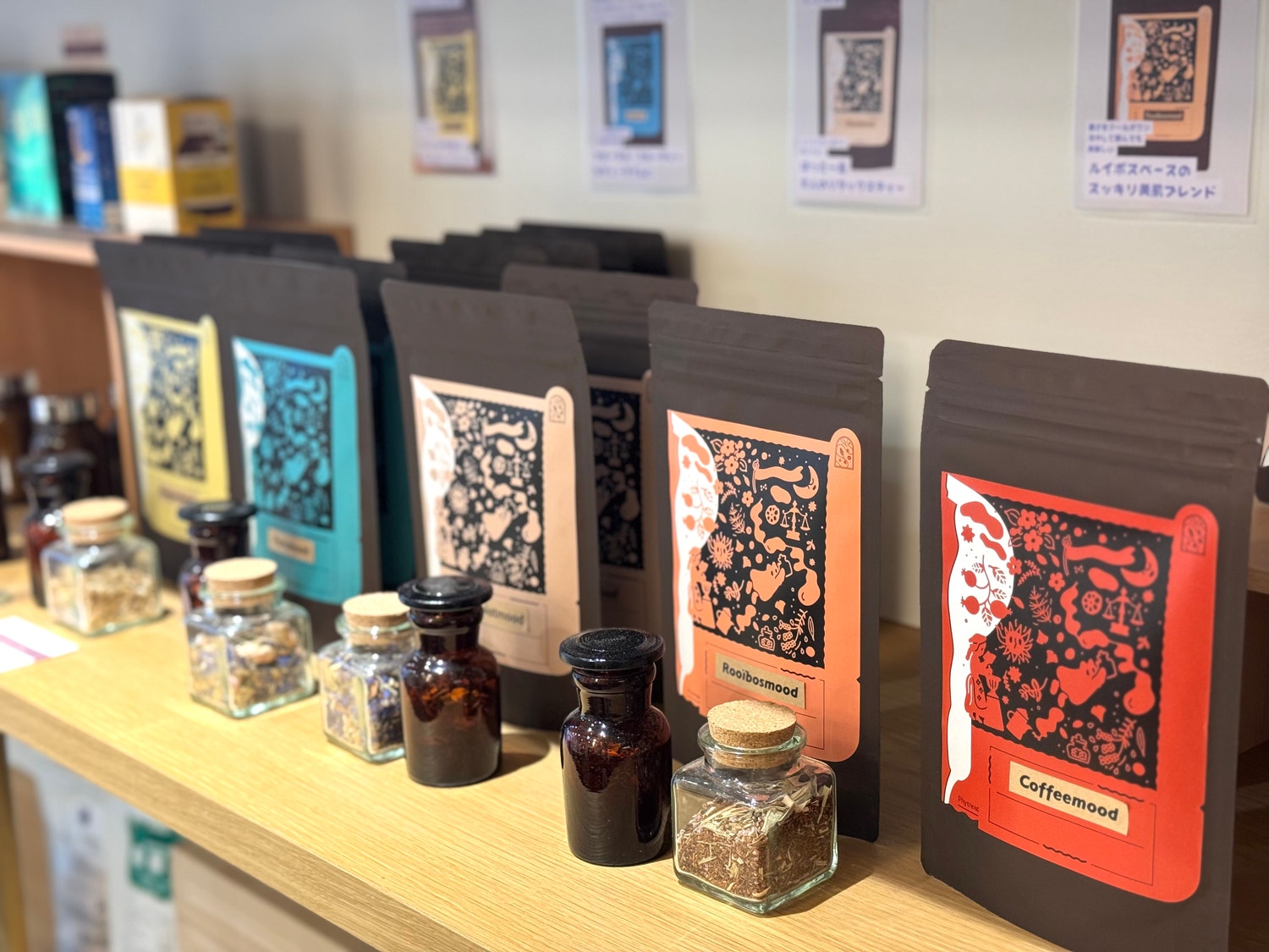 ハーブエリアにはおなじみの「mood herb drink」をはじめとしたブレンドハーブやシングルハーブ、樹脂なども展開しております。