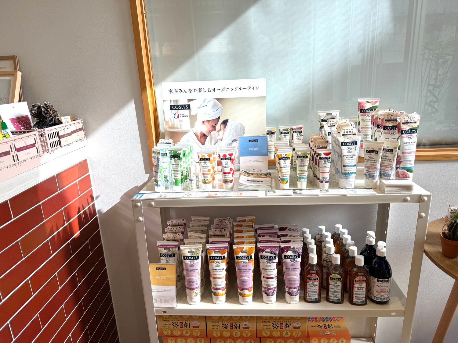 エントランス付近には仏発のオーガニックボディケアブランド〈ココリス〉の製品がずらり。店頭でテクスチャーをお試しいただけます。また「ウチダの生薬浴剤」も充実。